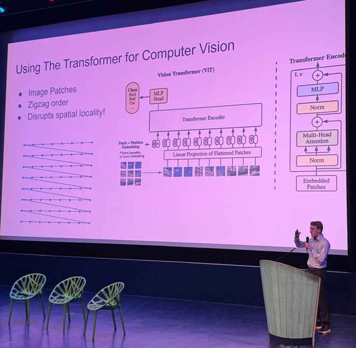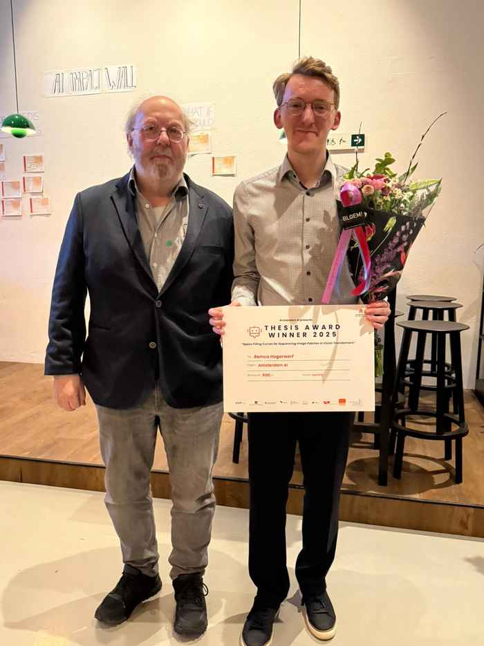 During the Amsterdam AI Impact Festival, Remco Hogerwerf, alumus of the IvI Bachelor’s Computer Science, was awarded the Amsterdam AI Thesis Prize. His thesis, ‘Space Filling Curves For Sequencing Image Patches in Vision Transformers’, explores how alternative sequencing methods can improve how Vision Transformers learn spatial relationships in images. In four minutes Remco pitched this research to the community at the festival.