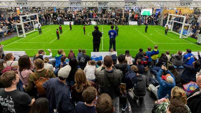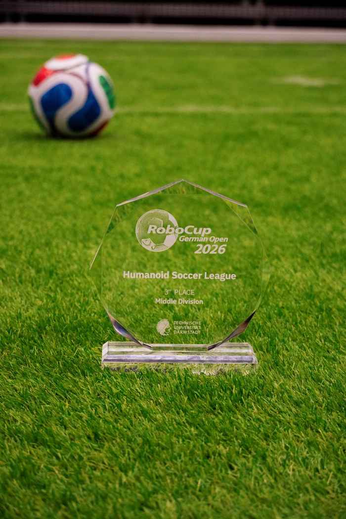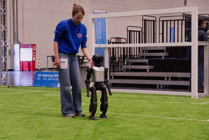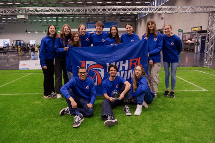 A mere three weeks before the competition, the whIRLwind team was racing against the clock to train their new robots. The students had used reinforcement learning to prepare their algorithms, strategies and behaviours in simulation, but these don’t always work correctly once transferred to a real robot. To compete successfully, their transformer-based object detection model had to be well integrated with the on-field positioning, and the robots had to make effective use of all the information they received for the football strategy. With all this more or less in place, the students headed to Köln to test their team’s abilities against teams from different German universities.