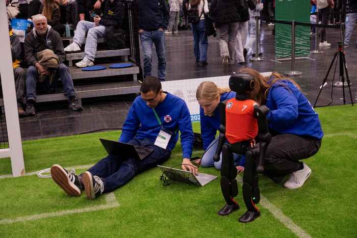 The first matches were a steep learning curve, with tweaks being made from the sidelines. The quarter final match however resulted in a 0-0 score and a penalty shoot out. Penalty shots were one of the things that hadn’t been tested yet. Luckily team member Julia de Vries had simulated a new kick as part of her thesis project for the Bachelor's programme in Artificial Intelligence. 10 minutes before the shoot out, the penalty-behaviour was loaded on to the robot. The robot swiftly fired the ball past the goalkeeper, and they won the match, eventually leading to an overall third place.