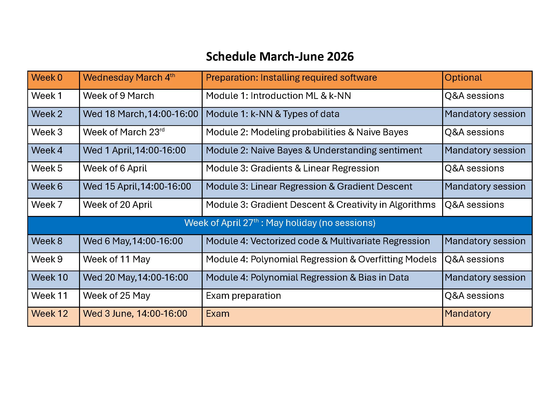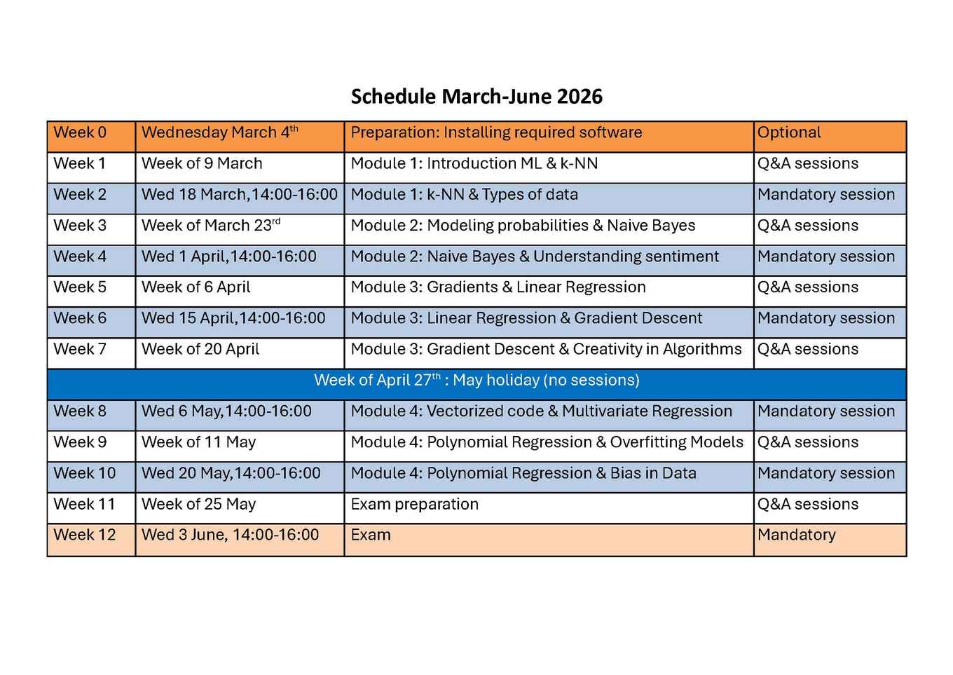 In the weeks with Q&A sessions there will be several timeslots to ask any additional questions you might have about the material. These are optional and you may attend whichever slot fits your schedule best. There will be slots scheduled every day of the week and the preliminary schedule for this currently is: